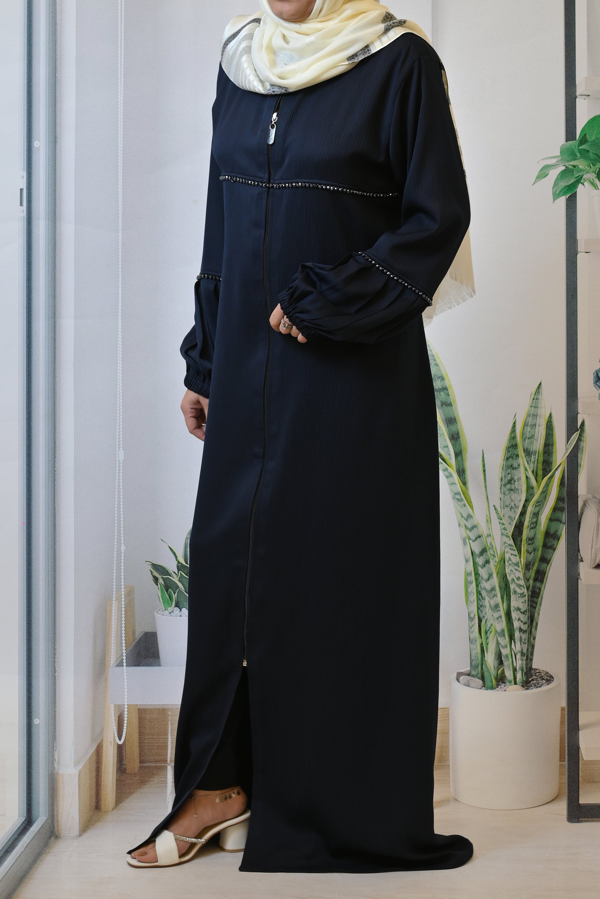 The front zipper is visible, emphasizing the abaya’s practicality and contemporary design.